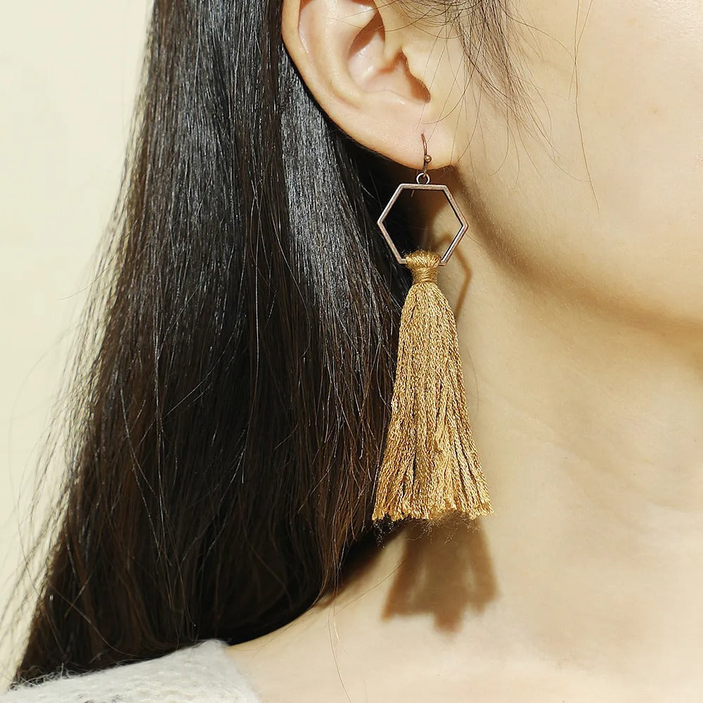 Add an earthy edge to your style with our Honeycomb Silk Tassels Earrings, featuring bold hexagon shapes accented with soft tassels for a rustic yet chic finish. These hexagon tassel earrings for women are the perfect blend of tribal charm and modern boho fashion, ideal for festivals, casual outfits, or statement everyday wear.